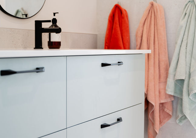 Nos designers cuisiniste ont crées une salle de bain pour enfants, conçue avec des couleurs douces et rafraîchissantes. Pensée pour évoluer avec vos enfants et durer de nombreuses années, elle offre à chacun son propre espace de rangement, favorisant l'efficacité et l'organisation. Le bleu/vert et le crème dominent cette pièce, créant une ambiance apaisante et accueillante, idéale pour les petits et les grands. Cet espace fonctionnel et charmant accompagnera leur famille au fil des années avec style et praticité.